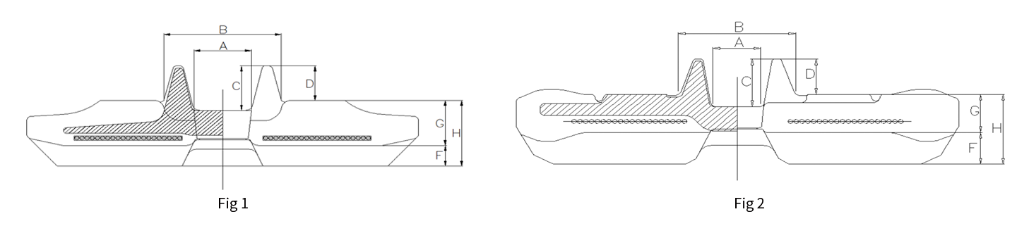 | 履带规格 (宽度×节距) Track Size (WidthxPitch) | 内轨宽度 lnner Guide Width(A) | 外轨宽度 Outer Guide Width(B) | 齿内高度 lnner Height (C) | 齿外高度 Outer Height (D) | 履带厚度 Track Thickness (H) | 花纹类型 Lug Pattern | 截面图 Section View | 支持类型 Guide Type | 节数规模 Range of Link No. | 备注 Remarks |